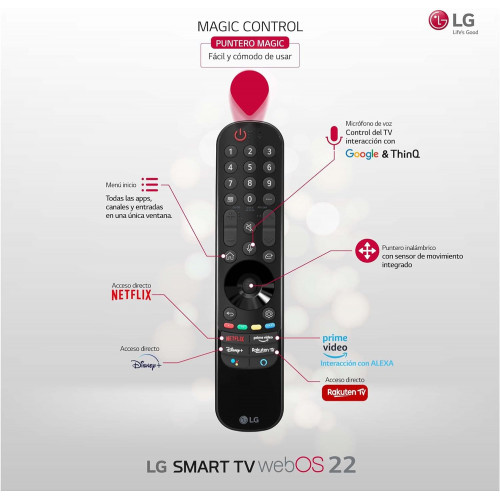 Ecosistema Abierto e Inteligente (ThinQ): Smart TV webOS22/ Compatible con Apple Home Kit, Google, Alexa/ Controla por voz todos tus dispositivos inteligentes compatibles.