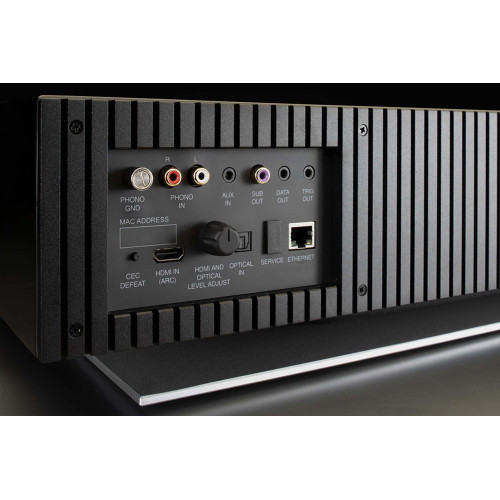 El sistema de altavoces McIntosh RS250 ofrece, entre otras cosas, una entrada de canal de retorno de audio (ARC) HDMI para obtener el mejor sonido de TV. También a bordo: 1x entrada óptica, 1x entrada fonográfica MM, 1x entrada AUX de 3,5 mm, 1x salida de subwoofer (RCA) y un conector para auriculares de 6,3 mm.