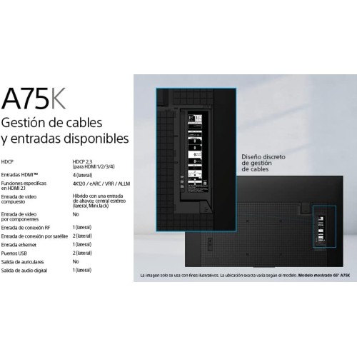| Nombre del modelo | Sony OLED 65A75K BRAVIA XR, TV de 65 pulgadas, 4K HDR 120Hz y HDMI 2.1 óptimo para PS5, Smart TV (Google), Dolby Vision y Atmos, Triluminos Pro |