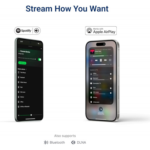 - Transmite desde cualquier aplicación con Airplay (por ejemplo, desde iPhone, iPads, iPods y Macs) o utilizando Spotify Connect. Los usuarios de Android pueden descargar "AirMusic" para transmitir a Juke a través de Airplay