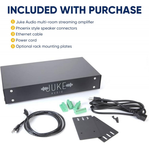 - Incluye un amplificador Juke-8 de 8 zonas, conectores de altavoz, cable de alimentación de 6 pies y cable Ethernet de 5 pies