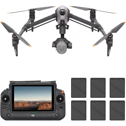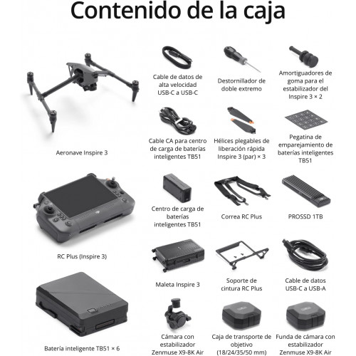 - Incluye: aeronave, cámara con estabilizador Zenmuse X9-8K Air, RC Plus (Inspire 3), batería inteligente TB51 ×6, centro de carga de baterías, PROSSD 1TB, maleta, hélices (par) ×3, etc.