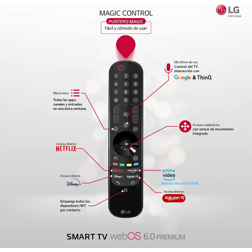 • Conectividad mejorada con 4xHDMI 2.1, 3xUSB 2.0, WiFi (802.11ac), Bluetooth V5.0, LAN RJ45, Magic Remote incluido