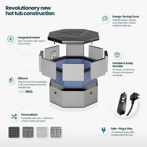 - MANTENIMIENTO SIN COMPLICACIONES: Disfrute de agua cristalina con un sistema de filtración fácil de usar y soluciones de cuidado del agua de bajo mantenimiento, para que pueda pasar más tiempo relajándose y menos tiempo limpiando. La bañera de hidromasaje Eco Foam combina un diseño elegante con un rendimiento inteligente. Perfecto para familias, socialización o relajación en solitario. Su forma espaciosa tiene capacidad para seis personas, mientras que el sistema de masaje de chorro de burbujas brinda una relajación maravillosa. El calentador ecológico integrado se calienta rápidamente a 40 ° C y es controlable por Wi-Fi para una comodidad sin esfuerzo. Construido con espuma aislante Wave Eco y materiales resistentes a la intemperie, es energéticamente eficiente, duradero y está listo en solo 30 minutos. Con un estilo audaz y una facilidad inmejorable, Wave convierte cualquier jardín en un spa durante todo el año.